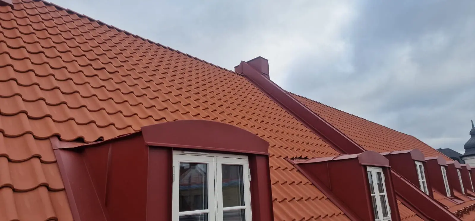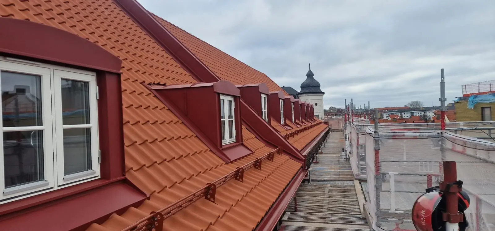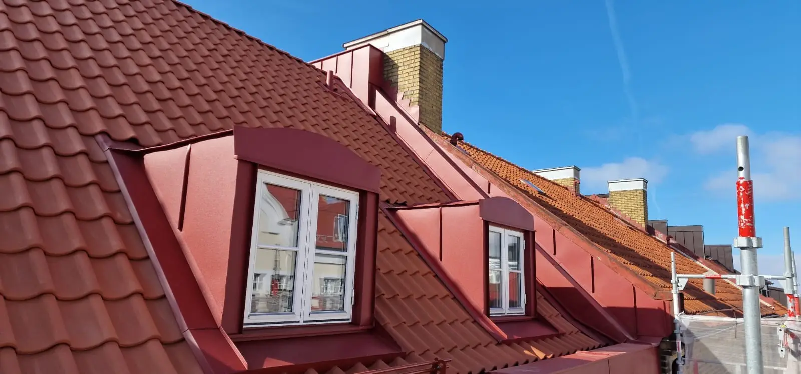 Här har vi utfört plåtarbeten vid en takomläggning på kvarteret Samson i Helsingborg. Plåtning i röd aluminium av skorstenar, takavvattning och kupor mm. Material från Areco, Helsingborg.