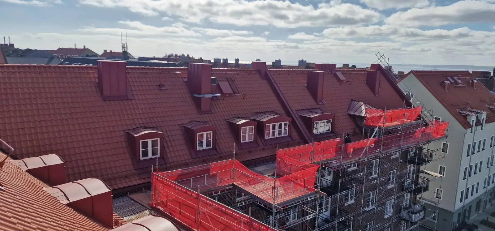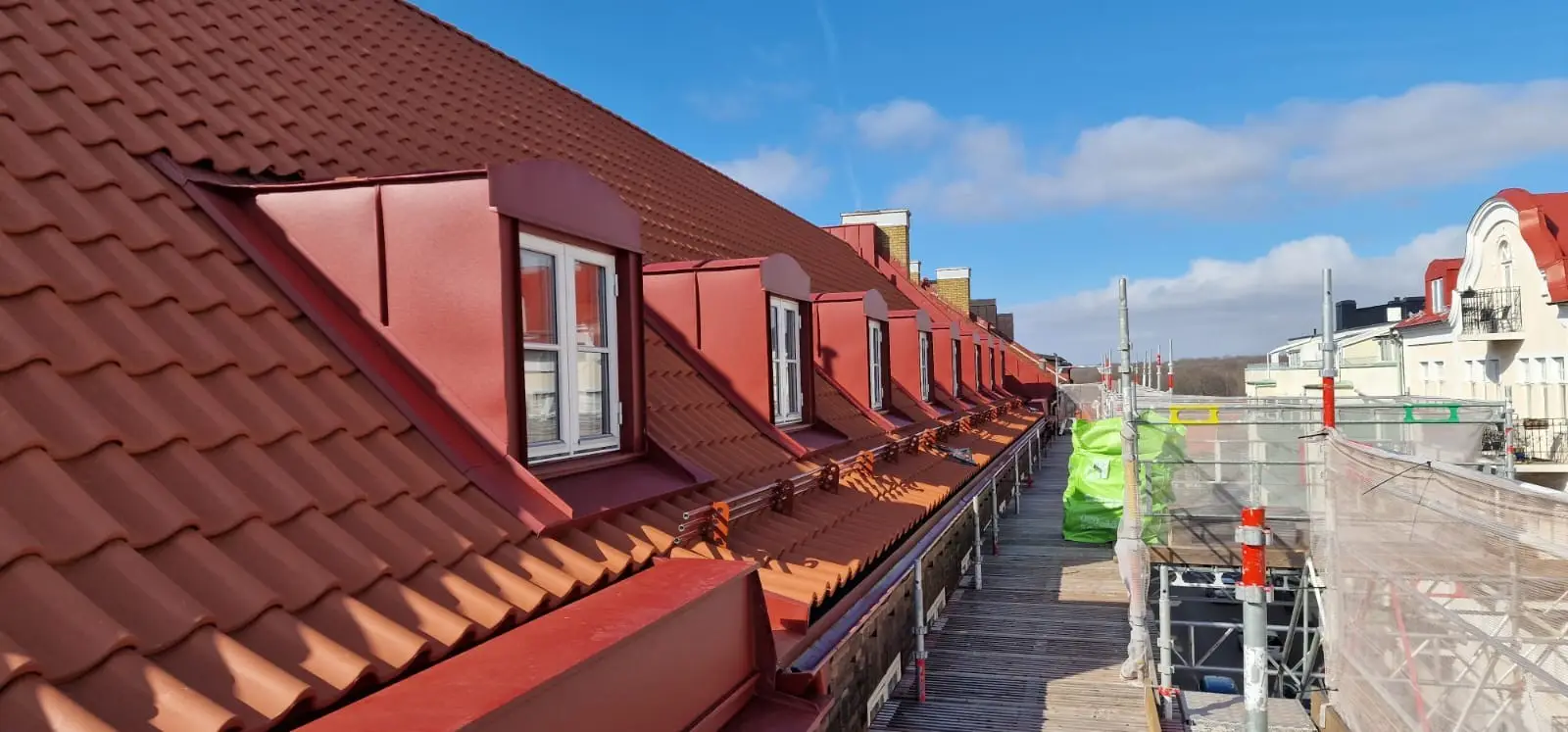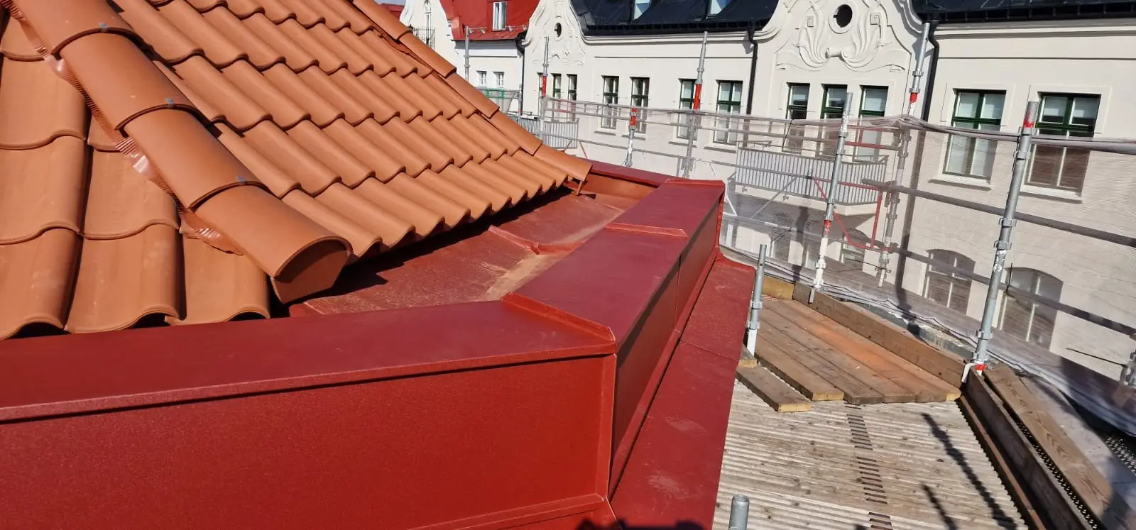 Här har vi utfört plåtarbeten vid en takomläggning på kvarteret Samson i Helsingborg. Plåtning i röd aluminium av skorstenar, takavvattning och kupor mm. Material från Areco, Helsingborg.
